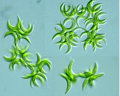Selenastrum is a small freshwater green alga with curved, crescent-shaped cells. It thrives under a