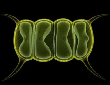 Scenedesmus is a freshwater colonial green alga typically forming groups (coenobia) of 4 to 8
